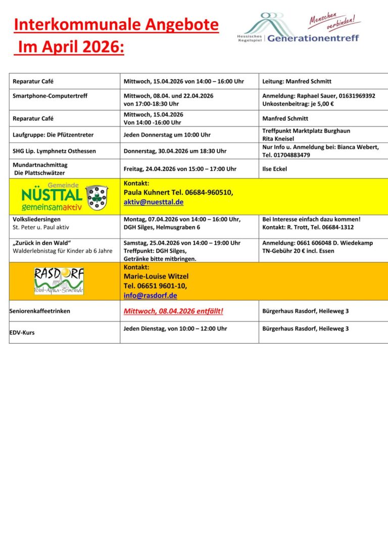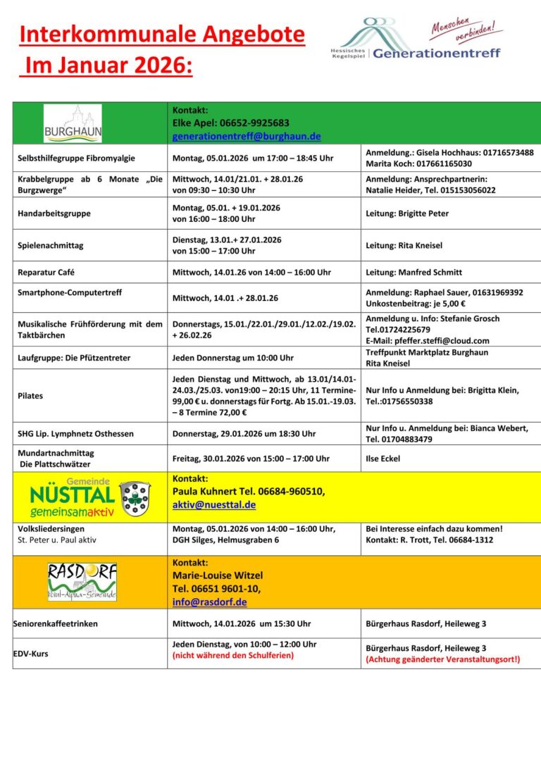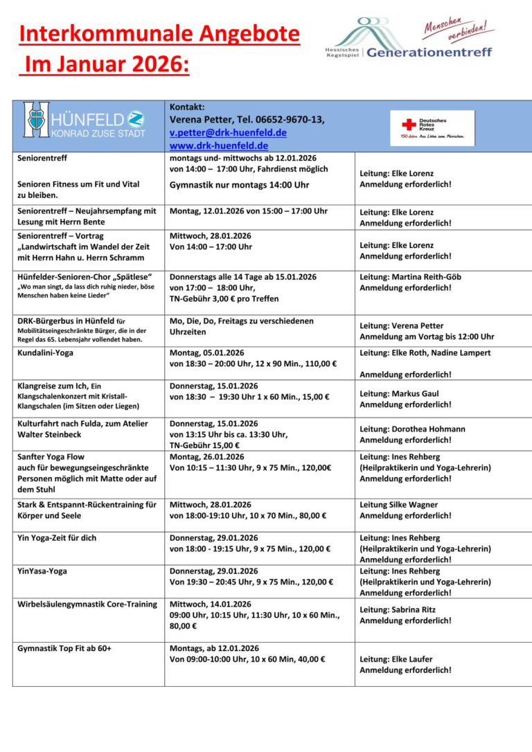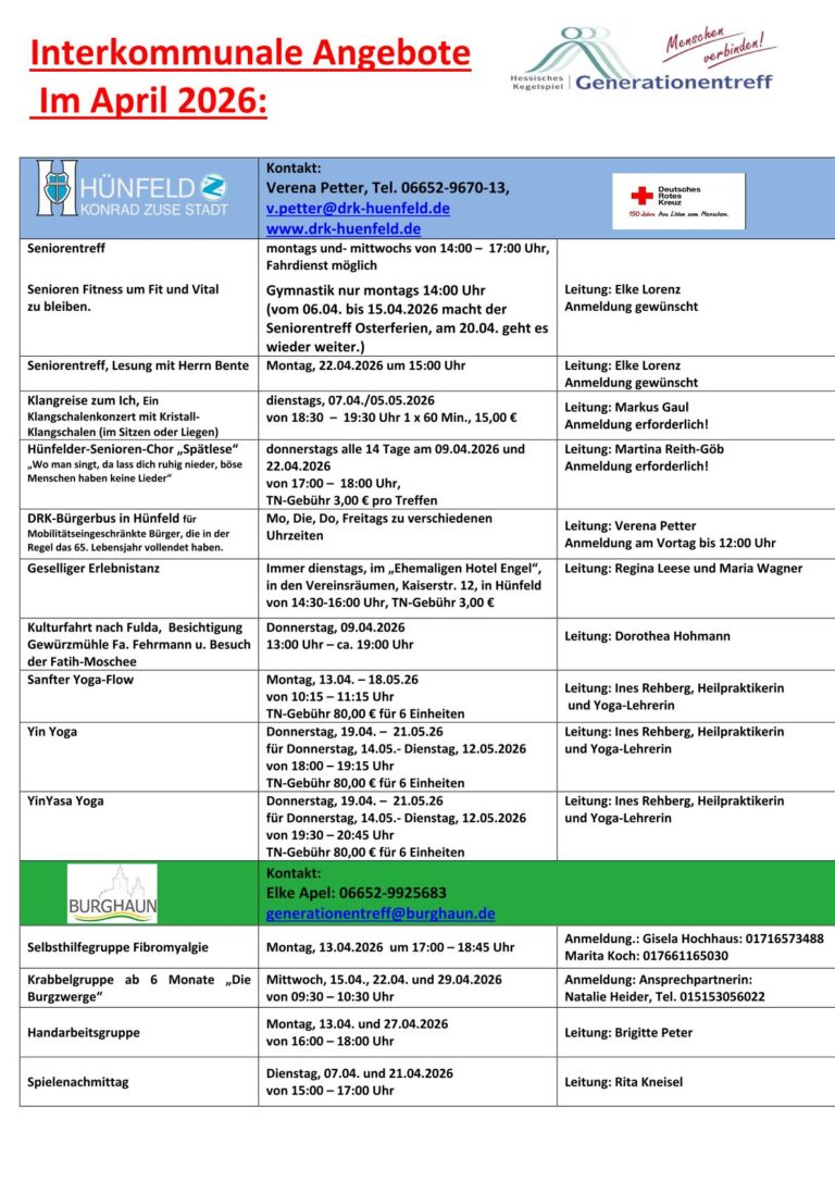 Der Generationentreff Hessisches Kegelspiel beim DRK in der Mackenzeller Straße in Hünfeld bietet ganzjährig ein umfassendes Kursangebot an. Diese Kurse finden nicht nur im Generationentreff selbst, sondern auch im Generationentreff Burghaun und im Gemeindezentrum Nüsttal statt.